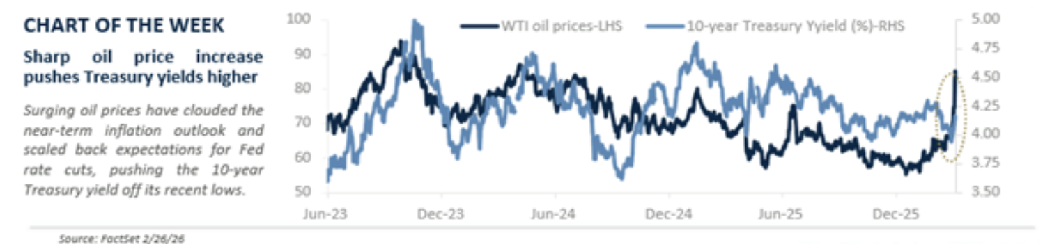 Asset class targets: The conflict has added to market volatility and clouded the near‑term inflation outlook, pressuring risk assets and pushing Treasury yields higher as investors scale back expectations for Fed rate cuts. History suggests, however, that these initial reactions tend to be short- As de‑escalation takes hold, markets typically recover and refocus on fundamentals. With earnings moving higher and the economy continuing to improve, we’re maintaining our 7,250 year‑end target for the S&P 500. Treasury yields have rebounded from recent lows amid higher oil prices, but that move has simply returned yields to their well‑established trading range. With our broader outlook unchanged, we are not revising our 4.25% to 4.50% year‑end target for the 10‑year Treasury yield.