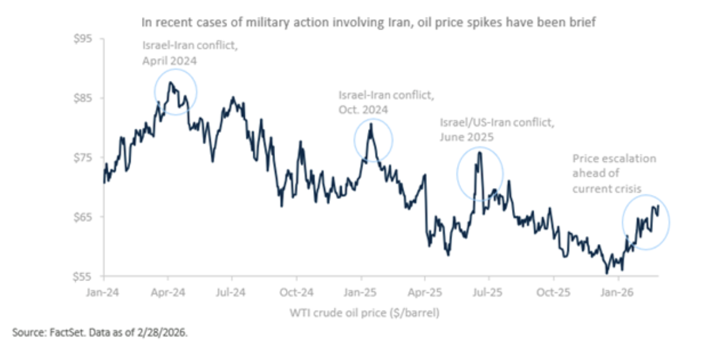 This latest crisis involving Iran has pushed up oil prices and may put short-term pressure on risk assets. History suggests, however, that these episodes are temporary, with oil prices eventually easing back toward more moderate levels. Geopolitical shocks are a recurring feature of markets. Maintaining discipline during periods of uncertainty remains a key driver of long-term investment success.